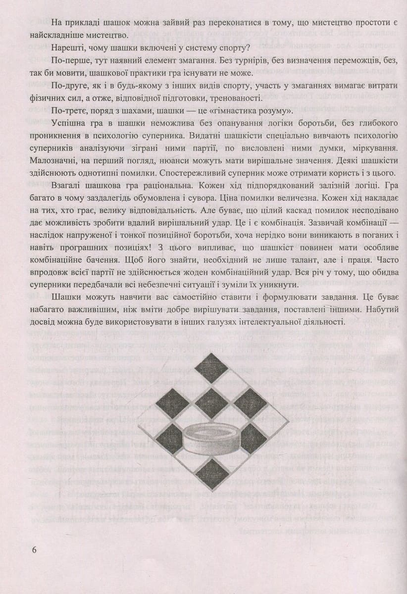 У посібнику подано основні відомості з теорії шашкової гри: правила, тактика та техніка. Розглянуто основні типи пасток у партіях розіграних на відповідальних змаганнях. Запропоновано достатню кількість зображень комбінацій для кращого візуального сприйняття. А також представлено завдання для самостійного вирішення та відповіді до них.