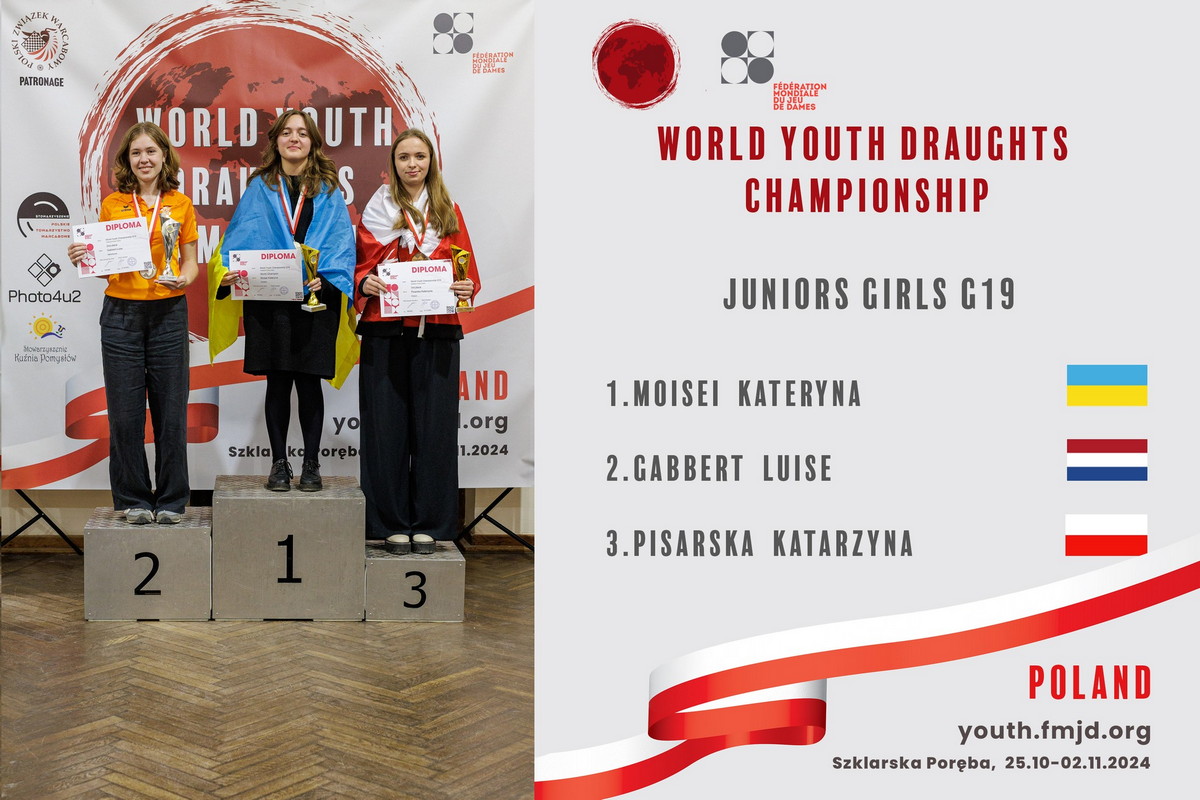 Проте й інші регіони України не «пасли задніх» на «мундіалі». Дуплетом «вистрілила» кандидатка у майстри спорту Катерина Мойсей з Іршави (Закарпатська область). Разом із своїм тренером Анатолієм Вайдою спортсменка зуміла завоювати дві нагороди у класичній та блискавичній програмах вікової групи «Юніорки» (G19). У першій шашкістка виборола «золото», у другій – «срібло». До речі вдалий виступ К.Мойсей у «класиці» може призвести до присвоєння їй двох звань – міжнародного Master FMJD та українського – «Майстер спорту України».