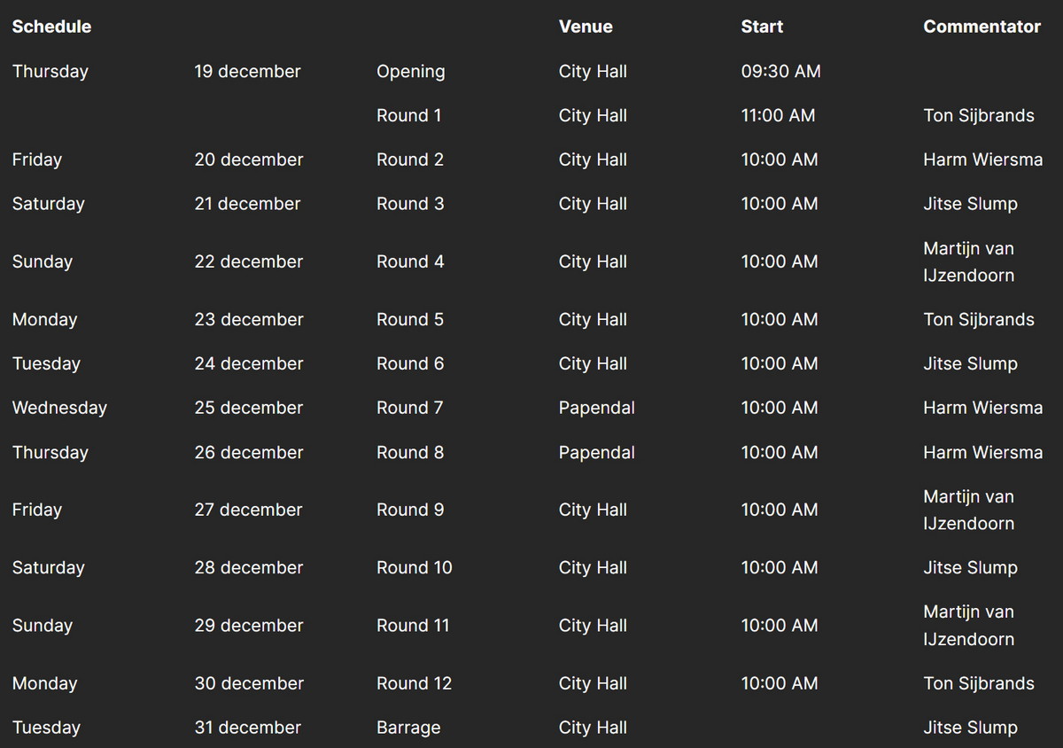 Став відомим час початку турів титульних матчів. Більшість раундів буде зіграно о 10:00 за місцевим часом. Через церемонію відкриття перший тур розпочнеться пізніше. Змагання стартують вже наступного тижня в ратуші Вагенінгена.