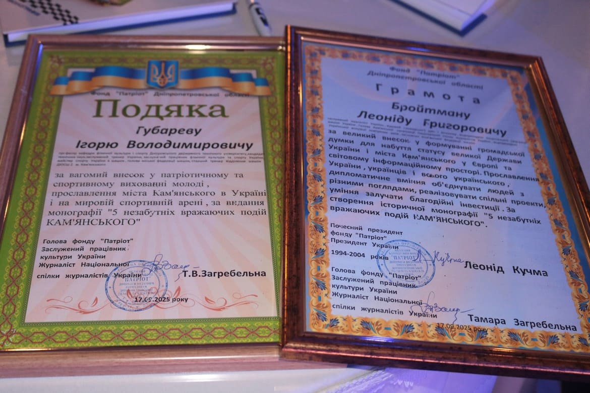 «На вогник» у Кам’янське також завітала представниця Благодійного фонду Україна та виконавчий директор Благодійного фонду Патріот, заслужений працівник культури України Тамара Загребельна. За розвиток спорту та шашок вона вручила авторам книги грамоту Л.Бройтману за підписом другого президента України Леоніда Кучми та Подяку І.Губарєву за підписом голови фонду.