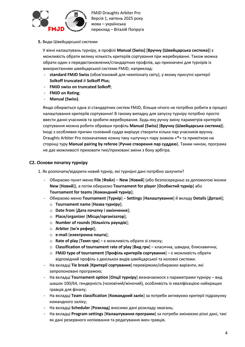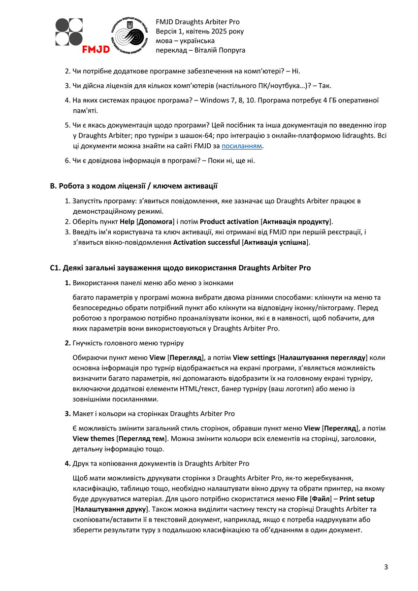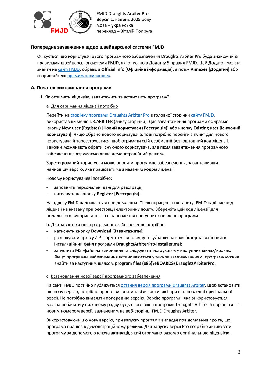 З оригінальним продуктом FMJD по користуванню програми DraughtsArbiter Pro, що призначений для проведення офіційних та неофіційних змагань будь-якого рівня, а саме з використанням програми жеребкування Draughts Arbiter Pro, можна ознайомитися на сторінці програми. У списку представленої документації по програмі Draughts Arbiter Pro, є посібник англійською, призначений для користування нею.
