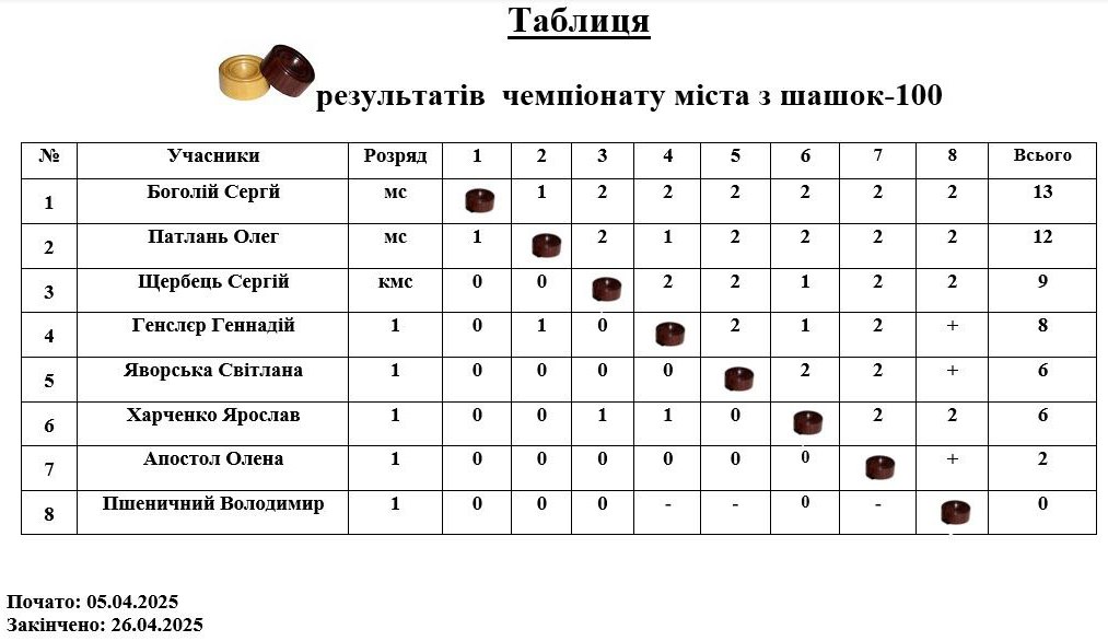 За результатами упорної боротьби чемпіоном міста став майстер спорту Сергій Боголій – у нього 13 очок з 14 можливих. На другому місці ще один майстер спорту – Олег Патлань, який набрав 12 очок. До трійки призерів з 9-ма очками пробився кандидат у майстри спорту Сергій Щербець, в нього «бронза».